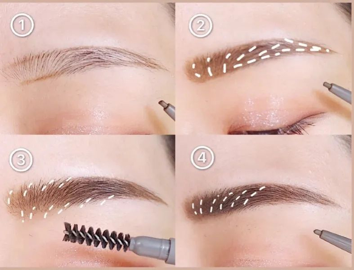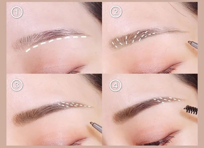 首先画出上下眉线的轮廓;然后用浅色眉笔填补空白;再用眉刷晕染边缘线;最后用深色眉笔加重画线区域即可~