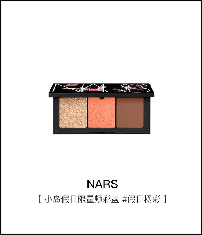 NARS新出的小岛假日彩盘看着颜色不多,但是该有的都有了,高光、修容、腮红,用来打造一个自然裸妆完全OK。假日橘彩这盘偏暖金色,对黄皮很友好,而且高光是金色细闪,不会过于夸张。这款的修容也是带有淡淡细闪,可以用来轻扫脸侧或鼻头处,会丰富阴影处的细节。