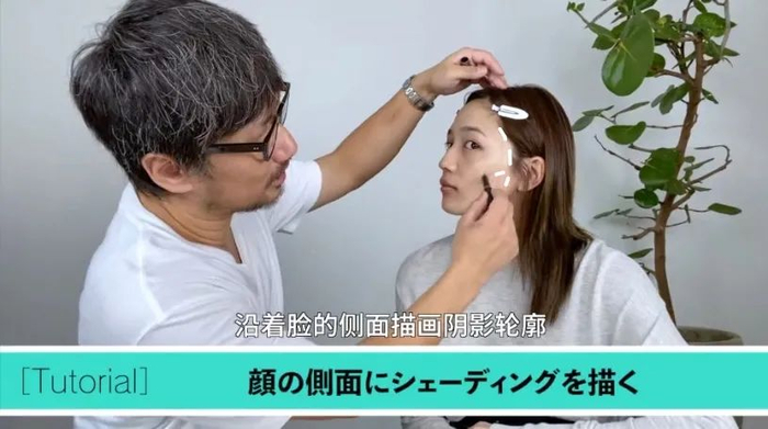 如果是脸型本身就比较小巧的话,稍微来一点修容就可以很好地调整轮廓了。这里河北裕介是用修容棒在模特小姐姐的左脸侧轻轻画了一个反向的“E”(如果是右脸就画正向),然后用美妆蛋推开蹭匀就可以了,侧面原本突出的颧骨也可以顺势平下去。