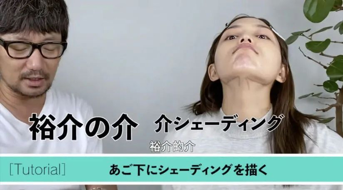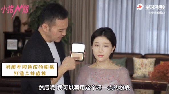 除了脸侧,他还会在下巴处进行修容,这样可以让下巴收进去,下颌线条紧致起来。方法也很简单,画一个“介”字,再同样用美妆蛋向下推开即可(可以看出模特小姐姐展示的hin努力)。下巴处轮廓比较圆润的宝宝可以试一下这种手法,千层下巴抹完也能变一层。