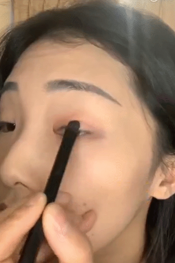 整个眼妆中,眼线是灵魂步骤!用棕色的眼线笔沿着睫毛根部画出一条内眼线,再轻轻向外延伸一下,下眼线也要画哦~(单眼皮女生的眼妆可是要精致到每个细节里!)