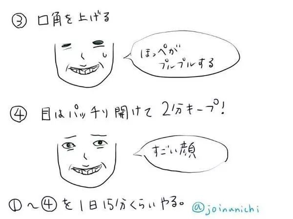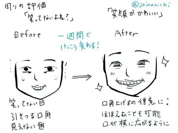 日本的一位网友在Twitter上分享过一套笑容练习法,是将作者自己的亲身体会以插画的方式展现出来的。通过练习,可以锻炼脸部肌肉,提高笑容质量~