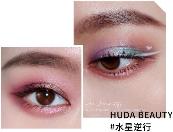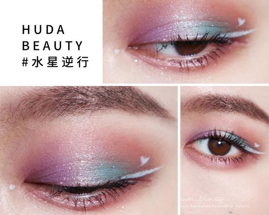 都说是最爱眼影盘之一了,牌面必须给足。为了不辜负这盘的美貌,这里还有个进阶画法。同样选一个哑光粉色在上下眼皮进行打底,随后用紫色细闪和薄荷绿色从眼角到眼尾在哑光上进行叠加,中间用NEBULA和SUPERMOON提亮都可以。用白色画眼线更能凸显这个配色的清冷和缥缈感~