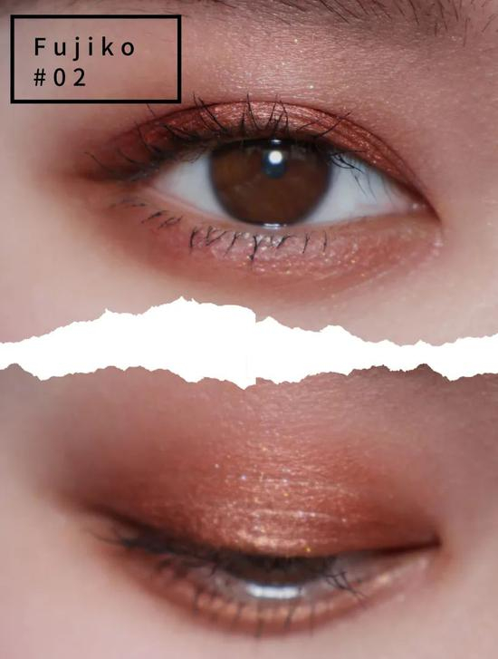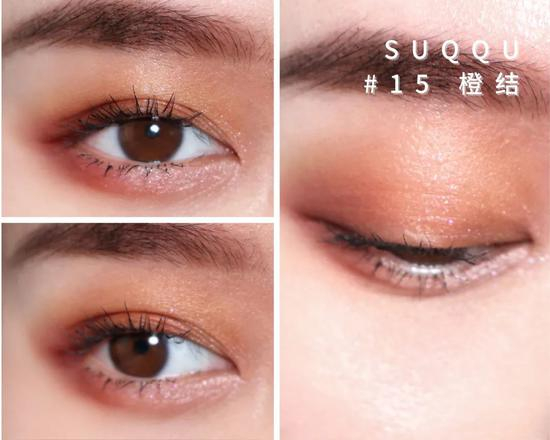 森绘梨佳也出过一个比较特别的画法,选择了橘色细闪在双眼皮褶皱的地方进行打底,再用金色提亮眼头眼尾和下眼皮的眼中部分,最后用香槟粉色细闪提亮眼角处。这个眼妆突出了橘色,在放大眼睛的同时,还呈现了波光粼粼的感觉,更加符合春夏季的设定~