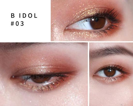 小编这里是用了哑光色作为打底,再用金色晕染上眼皮前半段,右上角的橘色细闪晕染上下眼尾,最后用香槟粉色细闪作为提亮。这个画法无论是春夏还是秋冬都非常适合!