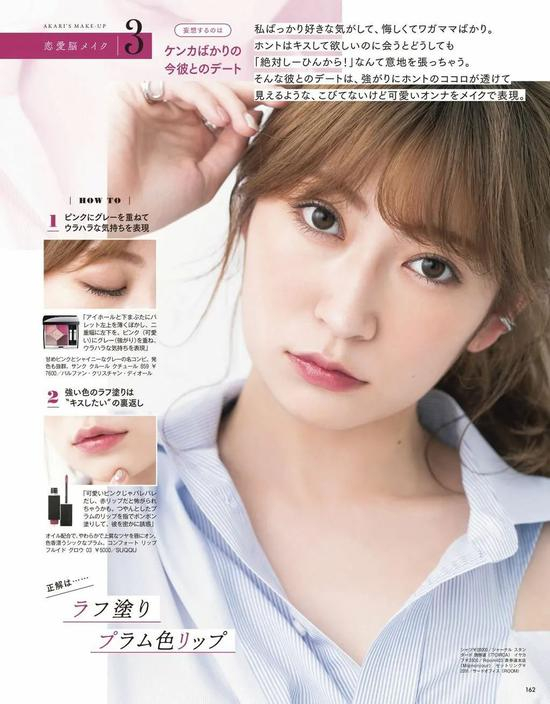 觉得玫粉色太突兀的小可爱们可以参考吉田朱里的这个画法,在眼窝和下眼睑处用灰紫色和粉色叠加,简直把吵架后约会时不耐烦、焦躁和逞强的心情表现得淋漓尽致~