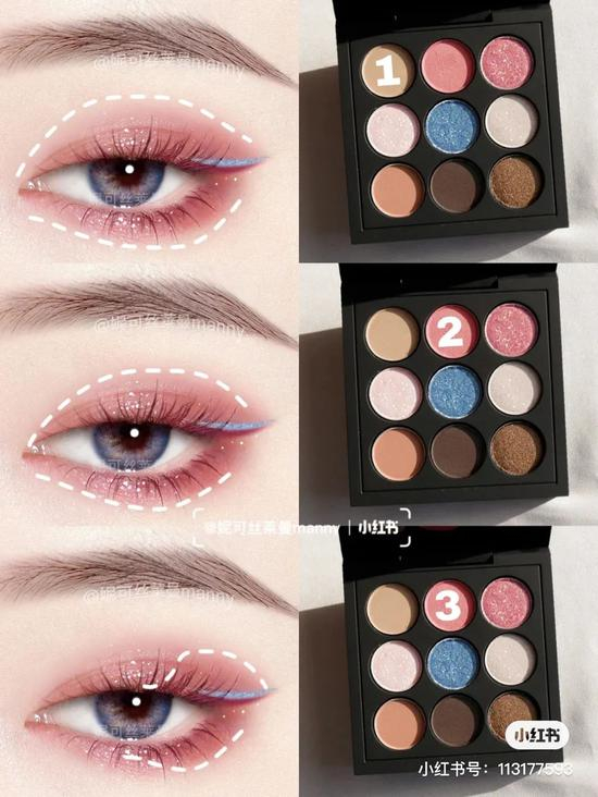嘿嘿,这款温柔撞色妆是不是既仙气又出众?!粉色作为主色调,温柔之中透露着满满少女感,再加上眼尾的蓝色点缀,瞬间多了一股灵气,粉蓝撞色真的太可了!