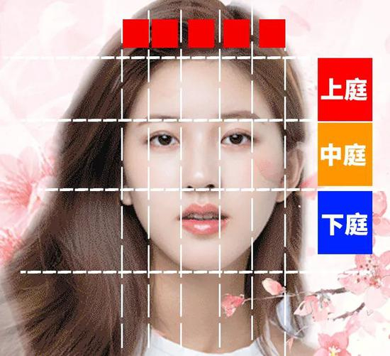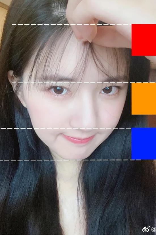 根据相同彩色方块的对比,我们看的出,小赵同学的上庭偏短,下庭偏长。理论上来讲,上庭短女孩五官会更加靠上,容易显得成熟,再加上她的下庭偏长,也是成熟感的一个标志