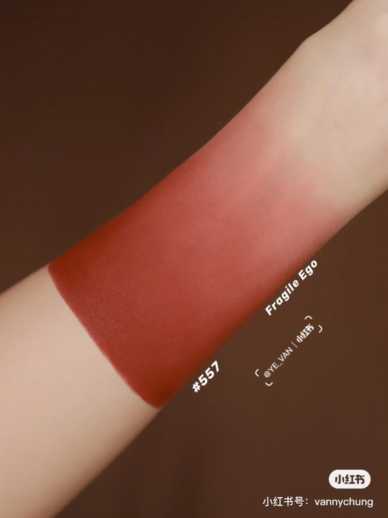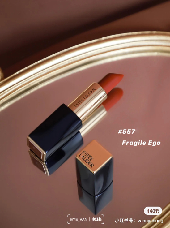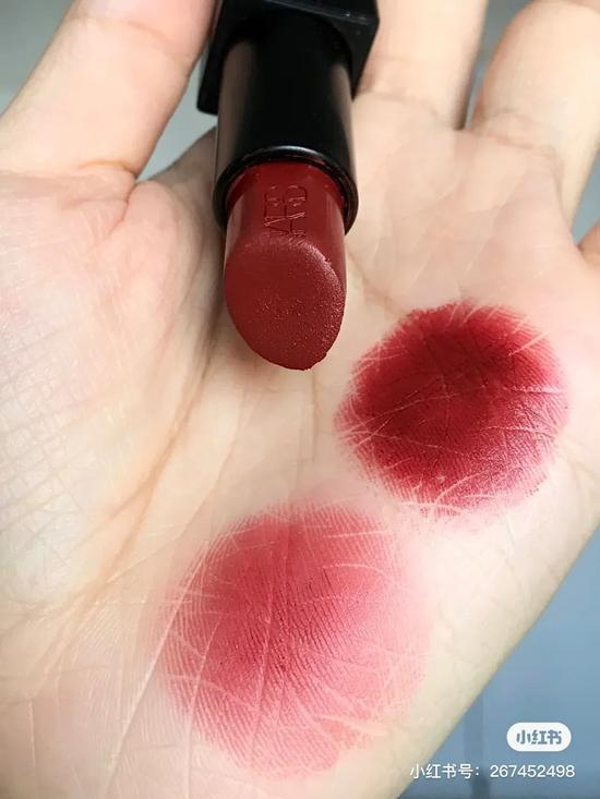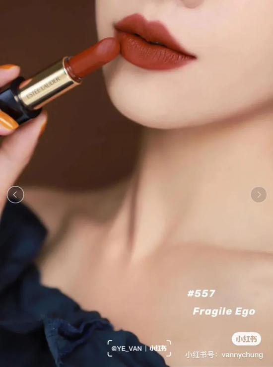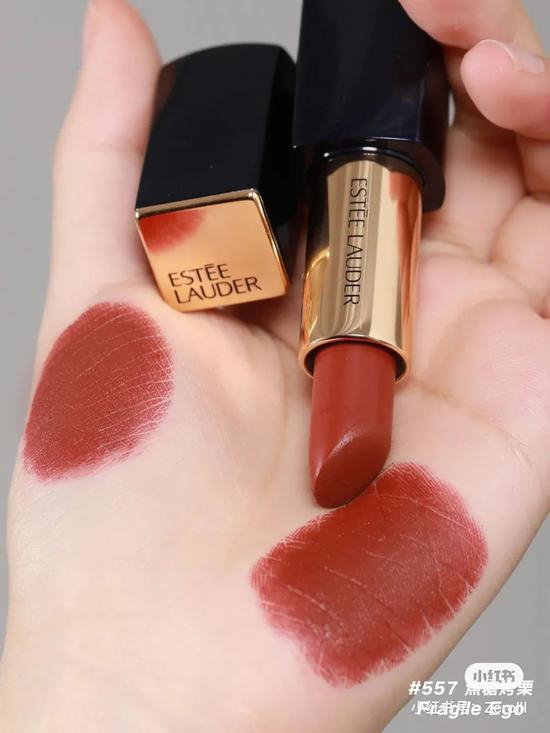 雅诗兰黛口红和NARS一样外壳都是磁铁吸附的,拿在手上很有份量。557号色是一个偏灰调的棕红色,红调和棕调平衡得刚刚好,一点都不显老。