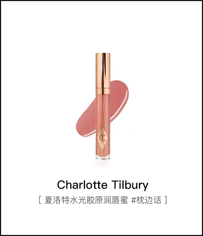 相比于透明的润唇啫喱,O姐更喜欢带点颜色的唇蜜,后续补涂的话也比较方便,不用再叠加口红。Charlotte Tilbury的水光胶原润唇蜜就很适合用来打造嘟嘟唇妆。“枕边话”这个色号就像它的名字一样,是那种在恋人耳边呢喃低语的性感。它的颜色介于豆沙和裸粉之间,无论是叠涂还是单涂都不会很夸张,涂完之后唇部变得水嘟嘟的,让人忍不住想要咬一口,别说直男了,O姐都扛不住啊!