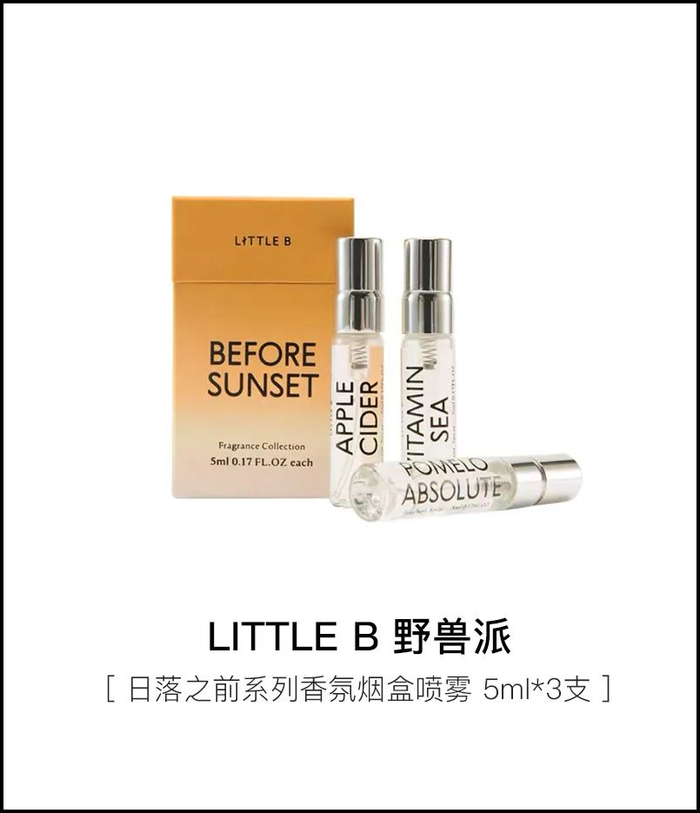 野兽派的这个香氛烟盒喷雾可以说是外出首选了,小小一只,还带喷头,放在包里随时补喷也很方便。“日落之前”系列的味道都是清新花果香,有“续命维他”、“微醺苹果”、“彻底葡萄柚”三个味道,5ml也挺耐用,喷完之后香味会淡淡萦绕在身边,不用担心太过刻意让他发现你的小心思哦~