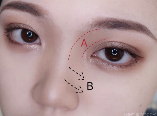 ①在眼窝处(A)反复填充鼻影,并和眉头、眼影衔接过渡均匀;按照箭头方向(B),用刷子上的余粉往脸颊轻微过渡。
