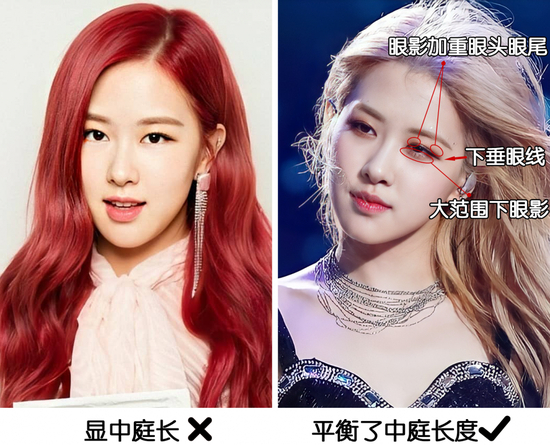 先是眼妆上,Rosé的内双可以说是她五官上最大的一个“硬伤”了。要变成一个“美人”,优化脸上的小缺点是首要!