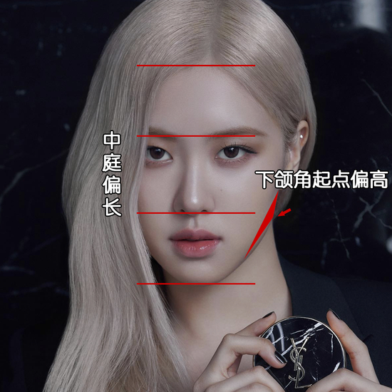 她也是四个人里面变美历程最长的,Rosé的面部骨骼量感比较强,下颌偏长下巴尖,鼻子较长,属于中庭较长的长脸类型。