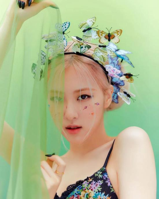 以及Rosé天生优越的冷白皮非常加分,比起深色的厚重感,浅色的头发更适合她,可以强化柔美感,增加仙气。
