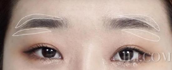 STEP1:初学者的话建议选择斜角眉笔,先将眉峰至眉尾处勾勒出来,确定一下眉毛的长度。Ps:眉尾的高度不要超过眉头!