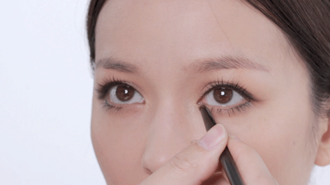 用眼线胶笔画出内眼线,在靠近眼尾的位置逐渐加粗,稍向外拉长;