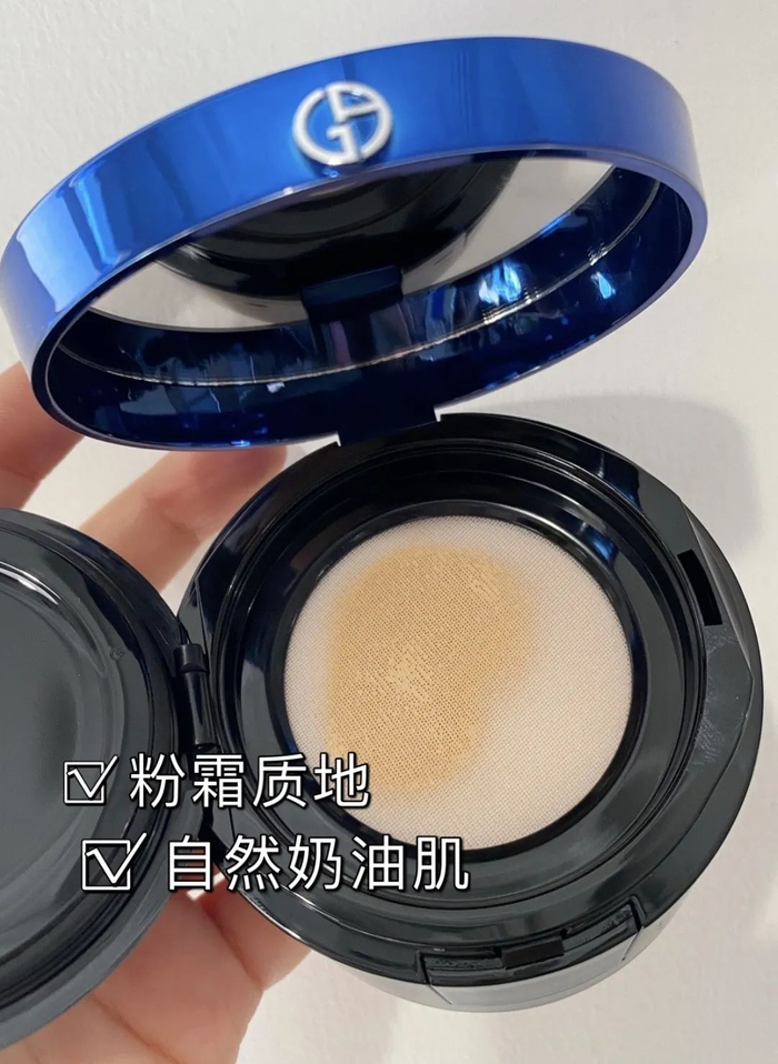 阿玛尼的这个蓝气垫就是专门给干皮打造的,但是我作为混油皮,现在季节用着也很适合。这款气垫里面其实是类似于粉膏的质地,用的时候轻按再转两下,可以更好地蘸取。上脸之后就是很水润的那种感觉(记得要少量多次的上,以免一次沾太多喔),像红血丝、浅痘印这种都可以遮的七七八八。