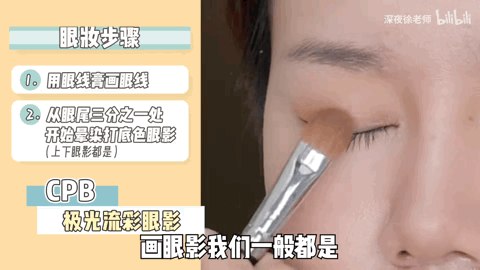 先用偏大底色的眼影在眼窝处大范围的做打底,如果找不到眼窝的位置,就用手摸眼球,凹陷处就是眼窝的位置哦~