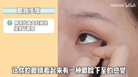 用亮片最大的颜色提亮下眼尾,让你的眼睛看起来有一种眼睑下至的感觉,楚楚可怜。珠光的颜色,铺在眼球中间的位置,可以让你的眼睛看起来更明亮。