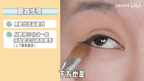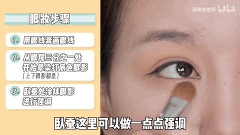 下方也是,从眼尾的三分之一处开始晕染过渡到眼头,卧蚕处可以多加一点强调眼型。