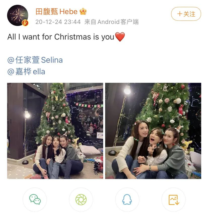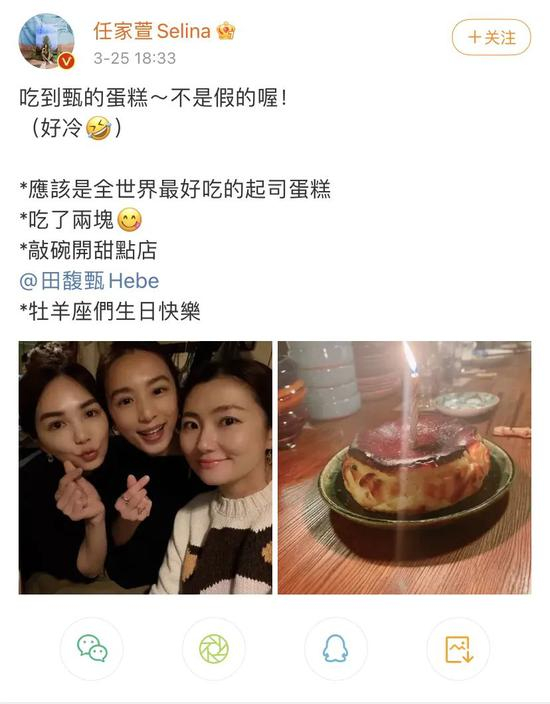 今天Selina提前为Hebe庆生,三人发的合影说是少女聚会!皮肤状态通透又细腻。
