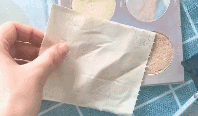 按压结束之后,眼影里可能还会残留一部分水分,等里面的酒精挥发掉之后再按压一次,用纸巾压吸取多余的水分。
