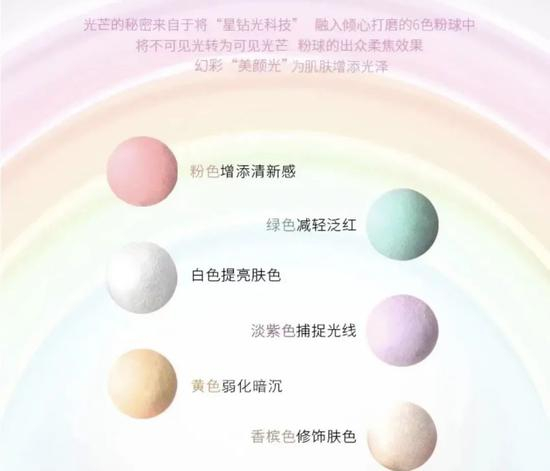 这款散粉以“星钻光”的概念创造,意在打造肌肤独特的璀璨光芒。里面6种不同颜色的粉球,每一枚粉球内核都含有一颗星钻微粒。它一旦与光接触,就会使光衍射到新方向,变幻出五彩棱镜般美妙的感觉!(真的感觉好神奇!)