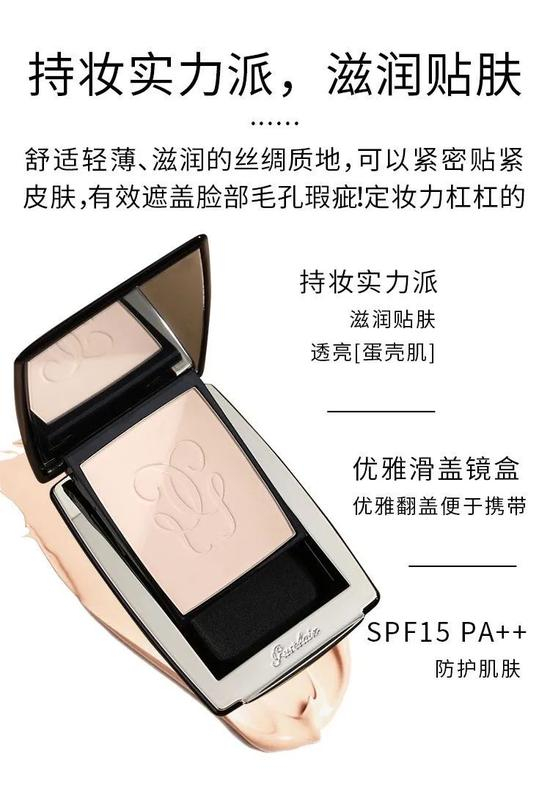 质地是介于粉底和粉饼之间,没有过多的粉感,摸上去粉质柔滑细腻。上脸后能够与肌肤完全贴合,帮助均匀肤色。有多个色号可供选择,一般只要选对肤色,能够让你的妆感达到前所未有的美丽!