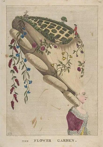 她们那会儿,最高的发髻,能够可达到3英尺(差不多0.9米),不光需要假发,还得加上马毛做的垫子、棉花、铁丝……才能把头发撑起来。