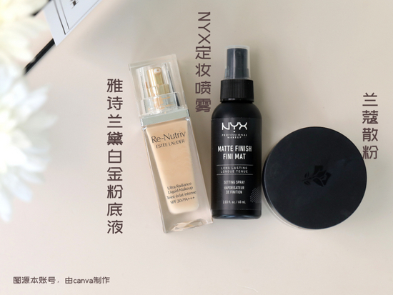 为了公平公正起见,狗砸固定了这次用到的产品,分别是雅诗兰黛白金粉底液,NYX定妆喷雾和兰蔻散粉,不论是干皮还是油皮,统统用它们(搞控制变量我是认真的)!