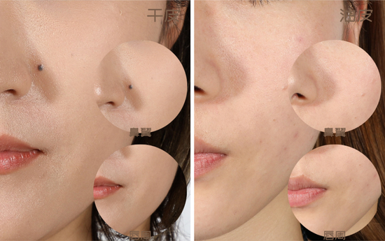 底妆刚完成时,妆效都挺不错的,左边干皮姐妹的鼻翼和嘴周没有丝毫卡粉的情况出现,更不要说油皮了。妆面服帖清透,出色!但是油皮姐妹的脸颊处已经有轻微的油光出现,狗砸比较担心之后的5小时持妆效果能不能扛得住。