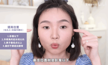 面中提亮的最佳位置,就是在卧蚕以下,外眼角延长线以内,鼻子最低点以上,不要超过颧骨。
