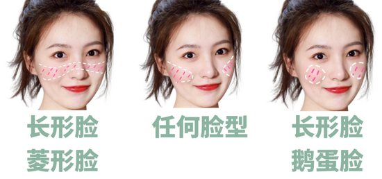 和修容一样,腮红的位置也需要根据你自己的脸型来改变上妆区域,但区分度会没那么明显,上手更快。