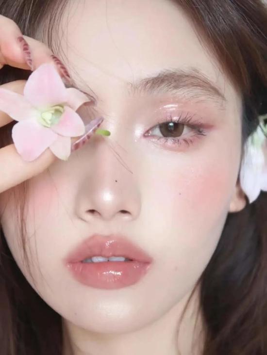 随意抹点色彩,底妆清透水润,眼周、脸颊就好像是少女皮肤自带的粉红。