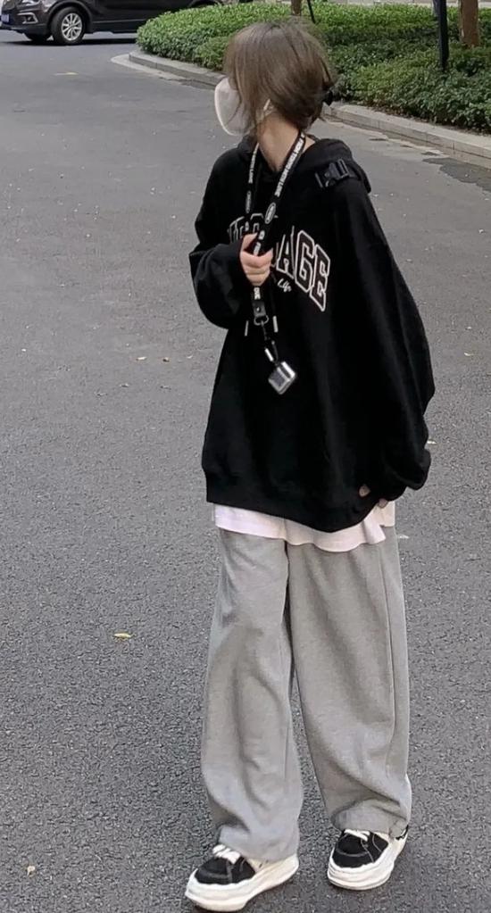 最简单的就是宽宽大大的卫衣配运动卫裤,藏在这些衣服里,整个人都松弛起来。换个亮点的颜色,再配个同色系的冷帽,保暖又可爱。