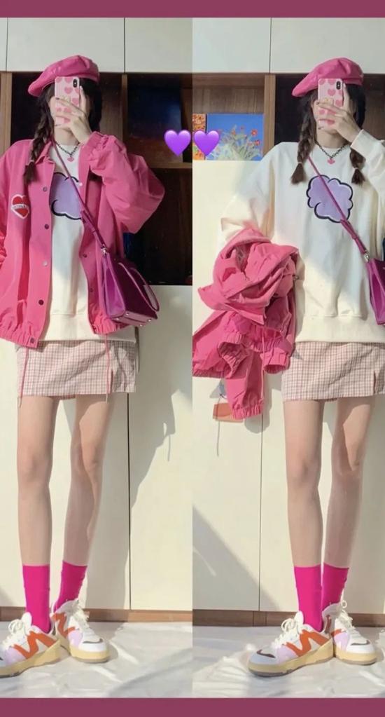 单品的选择上,把宽大的T恤换成合身的衬衫毛衣;短裙换成了半裙西装裤;帆布鞋也换成更正式的牛津鞋、皮靴。颜色上,青春洋溢的亮色穿搭也变成了低饱和度的温柔风格。看,同样是贝雷帽,黑色给人的感觉就比玫红色沉稳不少↓