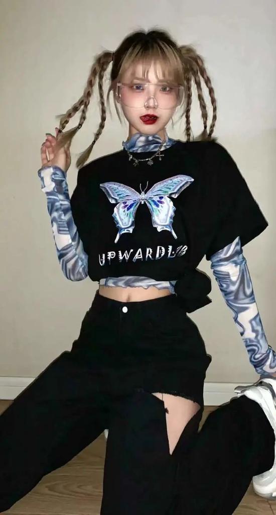 这一类的穿搭关键词就是“拼接”,善用各类材质的混搭。同样是蓝色花纹的贴身长袖,初阶玩法是穿在T恤里当打底配破洞牛仔裤,露一截小蛮腰强调身材曲线。把裤子换成金属感十足银色皮裤,未来感机械姬的味道就出来了。