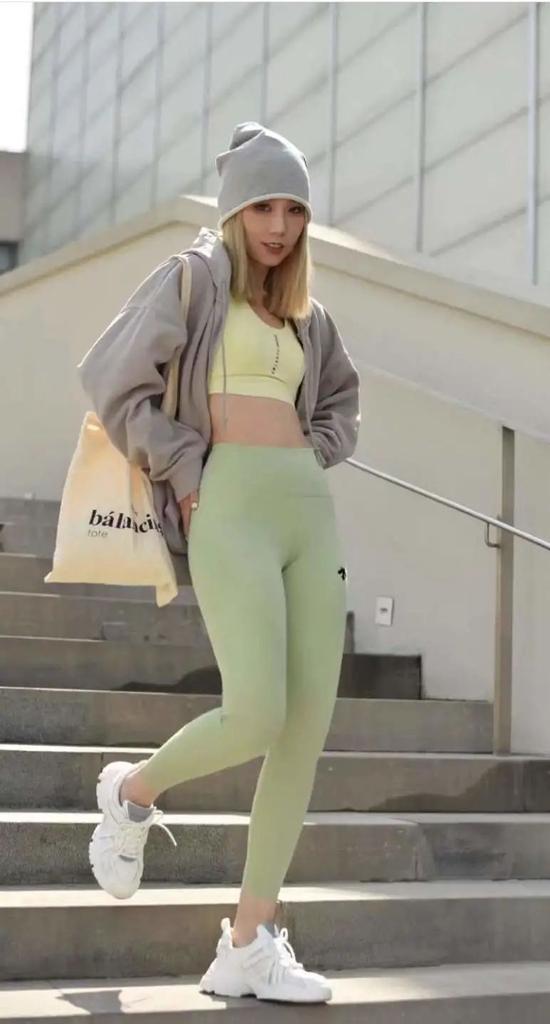 legging(紧身裤)外穿也是见怪不怪了,这套蜜瓜色好看又特别,脱下外套就能马上去健身。冬天冷的话,换成更白搭的黑灰色,穿上羽绒服、白袜子来御寒。