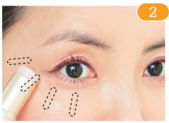 使用与眼线笔同色系的红棕色睫毛膏。从根部开始轻柔地勾画出轻盈感十足的睫毛。使用颜色相同的睫毛膏与眼线笔能够自然凸显出眼部的神采。将遮瑕棒涂抹在图中所示的位置,再用指腹轻轻地涂抹开。