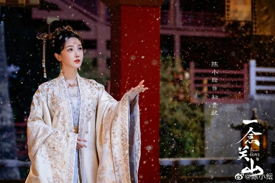 陈小纭在《一念关山》中饰演初贵妃,人物词是“绿萝粉黛笑意浓”。一份温婉,一份情意,和雪一同映入眼帘。