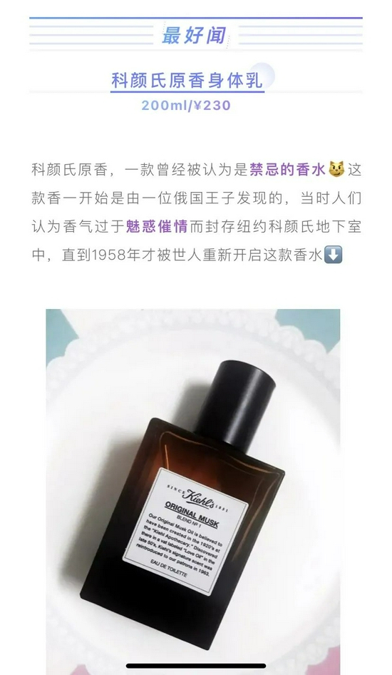 而在当时,这种香味被认为过于催情,以至于被搁置在地下室多年,直至1958年科颜氏的店员再次开启木桶,才发现了桶内的原创配方👀(从这里开始,原创麝香的故事一直流传至今。)