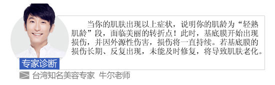 现象罗列:粗糙、缺乏水分,明显干燥的状况,由于外界环境刺激与压力而产生眼袋、双颊略为松弛或色斑等。