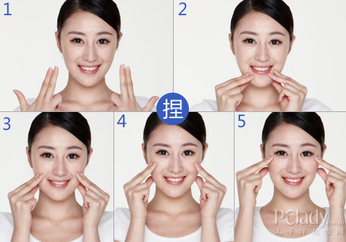 捏:脸部布满穴道,每隔约1公分就有1个穴点。以食指、中指指腹,由下巴往上至眼下区域,从内往外横向揉捏各穴点,疏通堵塞的淋巴。