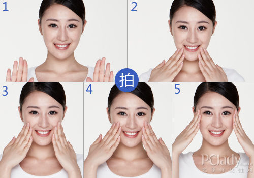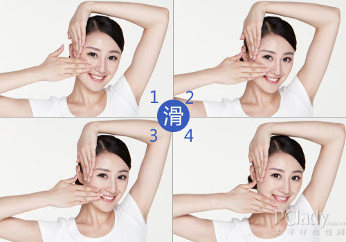 滑:一手往上绕过头至另一边脸的发际处并扶住,依序以眼下、鼻翼、嘴巴、下巴4处为起点,斜上拉滑至太阳穴,每处3-5次,重整分布紊乱的细胞,使其恢复紧密排列。