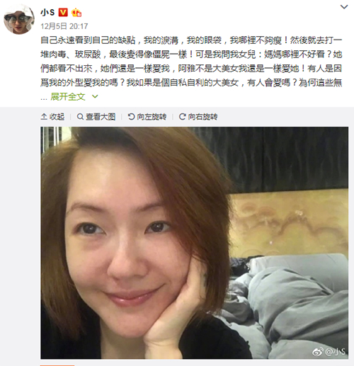 真的,哪个明星敢承认自己在脸上动刀?所以,小S就是小S,不得不佩服。但话说回来,小S说她为了脸上的泪沟和眼袋去打肉毒和玻尿酸,我们来看看她晒出的素颜图。