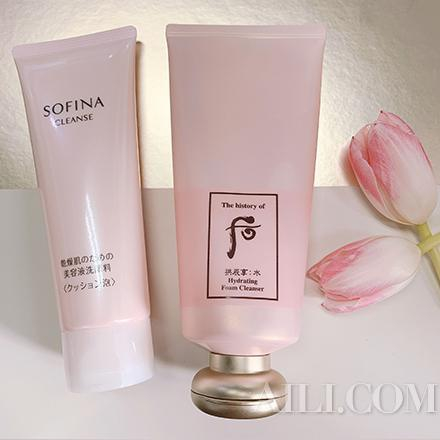 一般早上会用whoo后拱辰享水沄清透洁肤露,这款添加了山茶花提取物,香味儿也是淡淡的山茶花香很好闻,挤出来是透明淡粉色啫喱质地,轻轻揉搓就会有很绵密的泡沫,加水揉搓泡沫会稍微大一些,上脸特别舒服很好冲洗肌肤没有紧绷感。