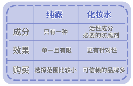 而化妆水可以根据不同的皮肤诉求添加不同的活性成分(通常不止一种),比纯露的选择性更广,针对性更强。