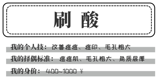 就算是不接触医美的妹子们,应该也听说过刷酸吧,人气超高的,就连刚刚小气泡的自我介绍中也提到了它。医美中的刷酸分为果酸换肤和水杨酸换肤两种,和平时护肤品中的酸类还是有些区别的。
