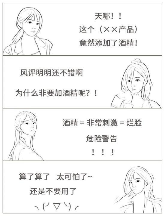 其实对于一般正常人来说,只要听到护肤品中添加了酒精,大部分人就只想躲得远远的,总感觉它是好皮肤的克星~小编还特意模拟了一下惧怕酒精成分宝宝的内心戏